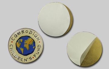Occasionally a lapel pin is not used as a pin at all. When is it used as a medallion and needs to be attached to an object, “nail” is left off and an adhesive backing is applied. Simply peel off the paper and stick it to a hard and non-porous surface and it will stay on. This attachment alternative is designed for permanent placement.